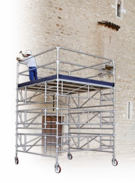 Cet échafaudage est l’outil parfait pour le travail dans les grandes hauteurs comme les gymnases, les sols délicats où nous ne pouvons pas rouler avec une nacelle. Les églises en rénovation sont aussi les chantiers qui sollicitent ce type de tour d’échafaudage.