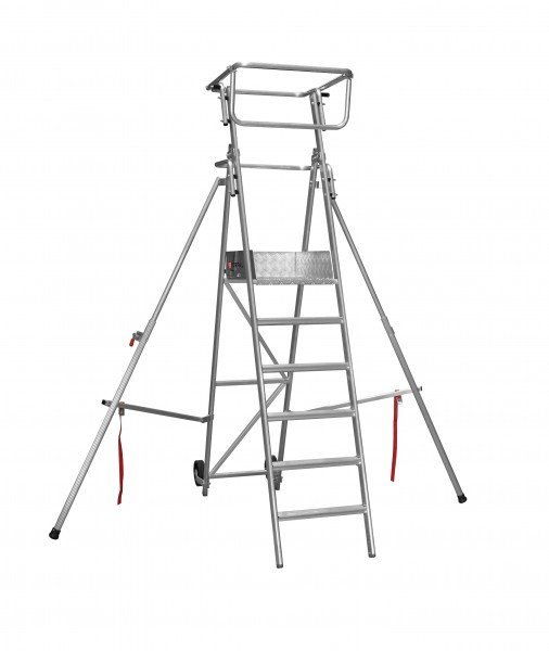 Une Plateforme simple d’accès, pliable, facile à déplacer grâce à ses roues diamètre 200mm. De plus, ses stabilisateurs télescopiques en aluminium rabattables et son plancher largement dimensionné permettent à une personne d’opérer en toute sécurité.