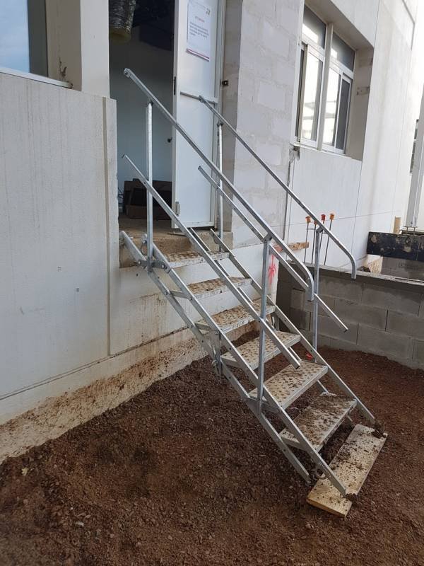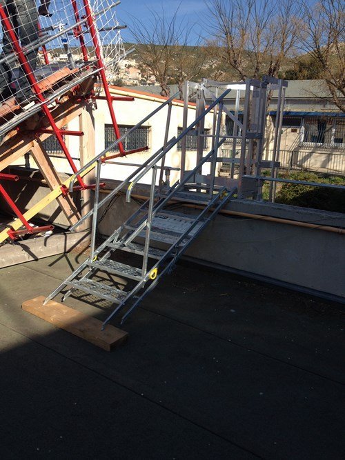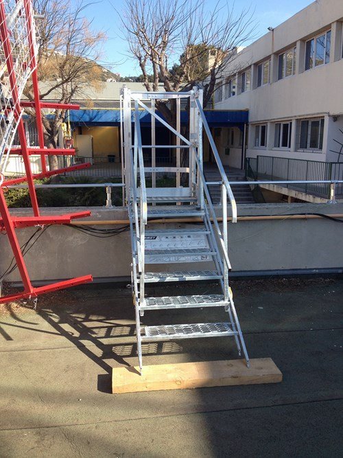 - Les escaliers de chantier se plient pour faciliter le transport. Il est possible de les monter préalablement à la longueur requise avant de les transporter jusqu’au chantier, mais il est facile aussi d’effectuer le montage sur chantier seulement par deux personnes.