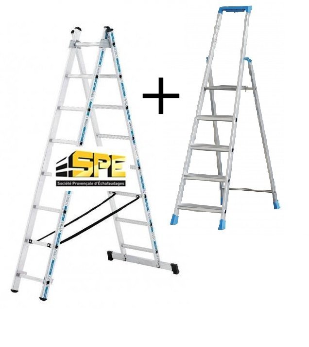 PROLINE ECHELLE TRANSFORMABLE 2 PLANS 9 ECHELONS ALU + MARCHEPIED STEPLINE 3 MARCHES TUBESCA COMABI
