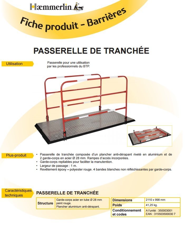 Passerelle de tranchée HAEMMERLIN avec garde-corps repliables pour faciliter la manutention.
