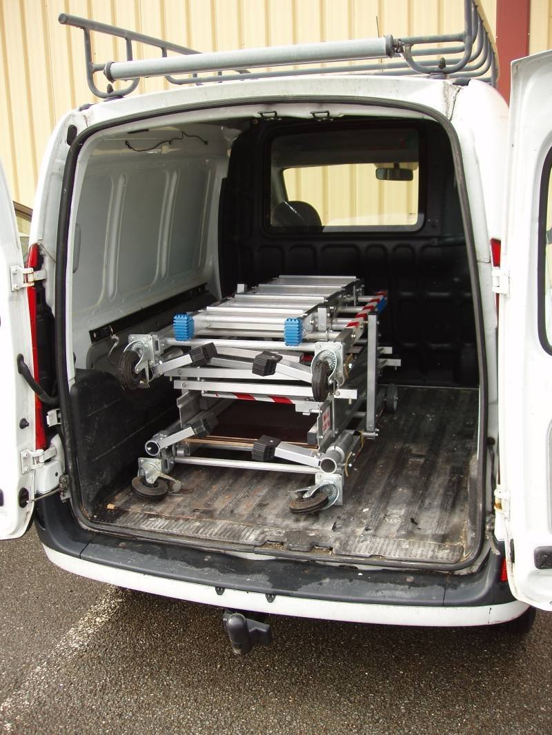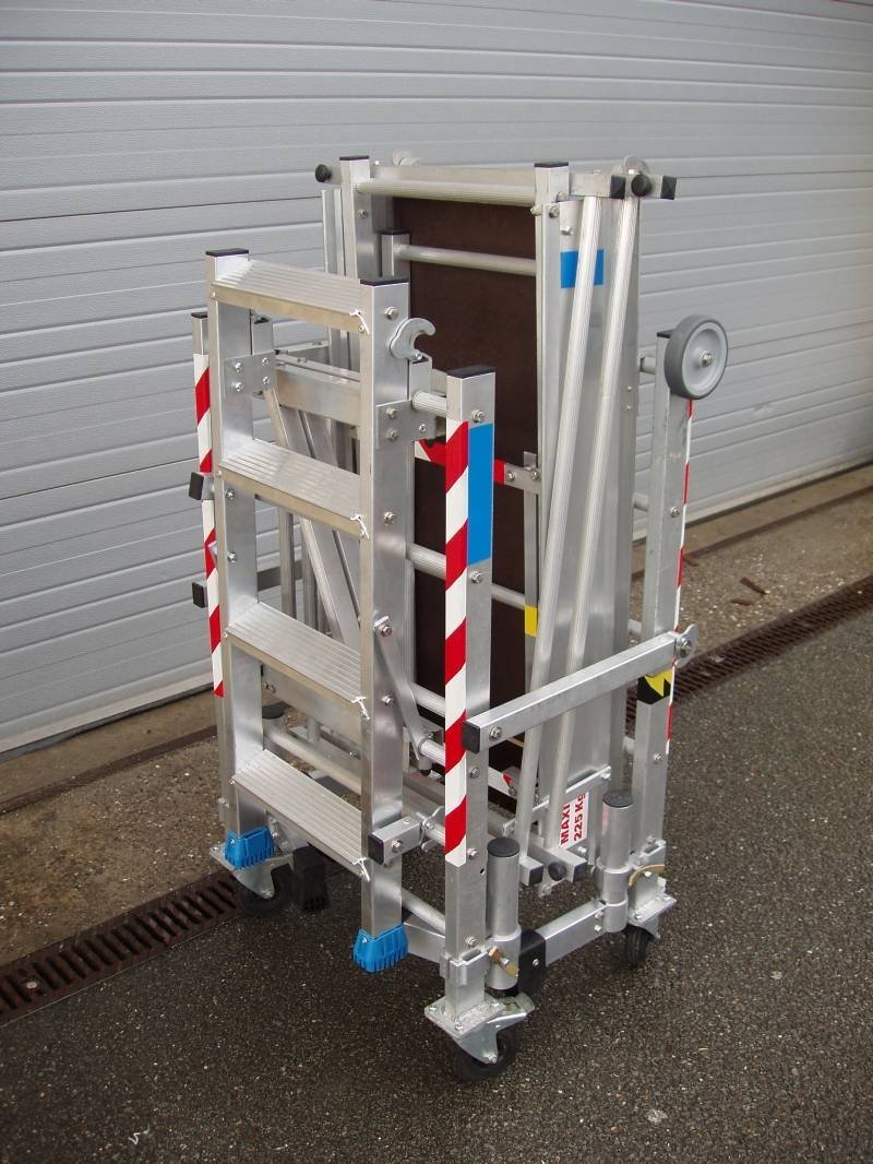 • Stockage monobloc, échafaudage  compact, se déplace aisément grâce à 4 roues aussi bien à l’utilisation que lors de son transport . (2 roues pivotantes escamotables + 2 roues fixes sur le modèle NMPR)