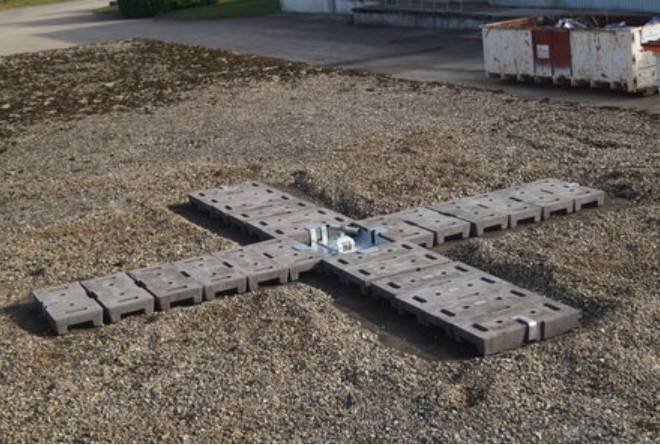 L’ensemble se compose de blocs de béton armé, posés sur quatre bras en acier. Les bras sont reliés au centre par une plaque de jonction