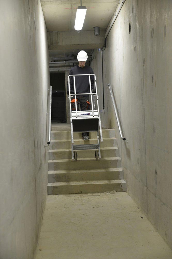 • CABRI la plate-forme spéciale circulation dans les escaliers (montée et descente) grâce à ses roues de déplacement Ø 200 m qui ne marquent pas le sol.
